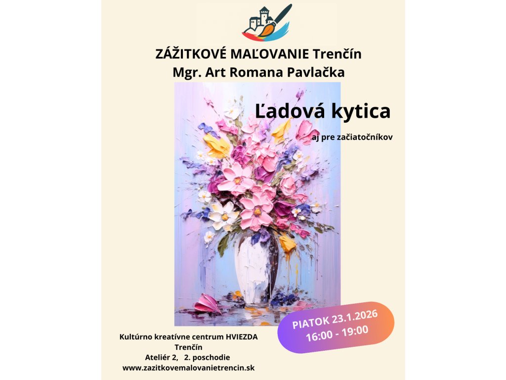 Zážitkové maľovanie v Trenčíne s motívom Ľadová kytica je relaxačný kurz zameraný na uvoľnenie, kreativitu a radosť z tvorby. Pod vedením lektorky si krok za krokom namaľujete vlastný obraz v zimných tónoch.
